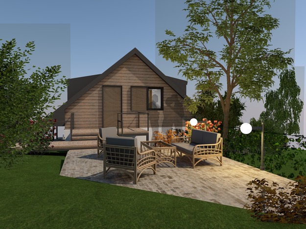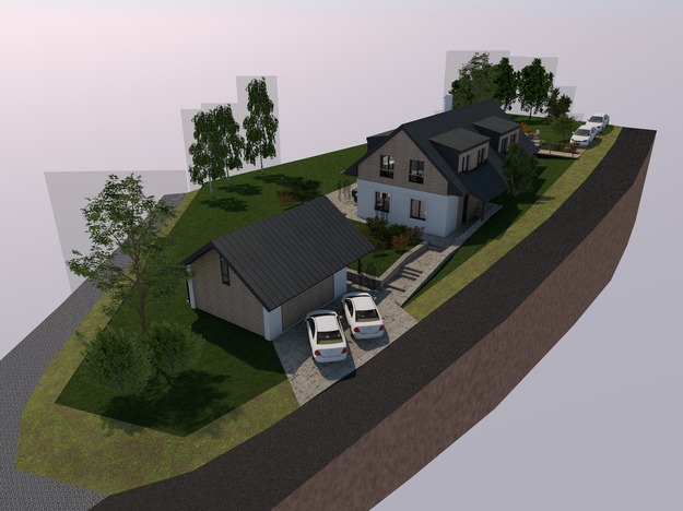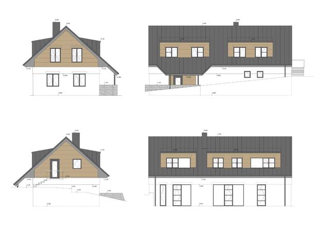 Novostavba rodinného domu s garáží je situována do malebné obce Jaroškov. Obec má zpracovaný územní plán a řídí se mírnými regolativy. Návrh respektuje venkovský charakter a vytváří nejen víkendové bydlení pro rodinu s dětmi a apartmán pro prarodiče. Garáž je řešená jako samostatný objekt ve stejném stylu s hlavním objektem. Podkroví je řešeno s vikýři s moderními prvky-např. dřevěným obložením.