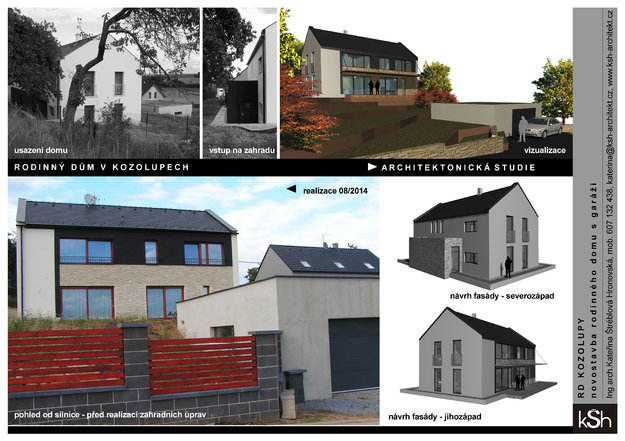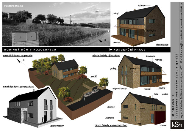 Novostavba rodinného domu s dvougaráží do prostředí rozvojové lokality malebné obce Kozolupy. Návrh domu je v douladu s regulativy obce. Garáž je jednopodlažní a je navržena se se zelenou střechou, v návaznosti na zahradní úpravy.