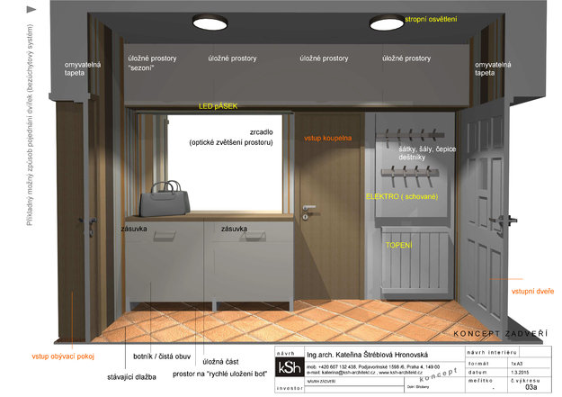 Návrh interiéru vstupní části rodinného domu spočívá ve vhodném rozmístění maximálního množství úložných prostor. Prostor zádveří je poměrně úzký, na každé straně jsou umístěny dveře (koupelna, obývací pokoj a plánované dveře do garáže). Nevýhodou tohoto prostoru je křížení "špinavé a čisté zóny". Proto se předpokládá okládání bot z venku hned u vstupních dveří. Je zde navržena sedací část s botníkem a "volný prostor pod potníkem" pro rychlé odložení bot. Tato část je doplněna zrcadlem a možností oložení "kabátů " na volnou tyč. V horní části se počítá s uložením sezónních věcí. V prostoru před obývacím pokojem jsou umístěny uzší prostory (zásuvky, přezůvky, botník dětkých bot atd..) - komoda + úložný prostor v horní části, aby byl zachován opticky příjemný prosotr pro pohyb v zádveří. V návrhu jsou použity světlé barvy - bílá v kombinaci s dubem (dle stávajících interiérových dveří). Náchylné stěny je možné pojednat "omyvatelnou tapetou " - v souladu se stávající dlažbou. Prostor nad komodou je doplněn zrcadlem opět pro optické rozšíření prostoru. Celé zádveří je doplněno o "umělé osvětlení", které prostor dostatečně prosvětlí a navodí příjemnou atmosféru útulného domova.